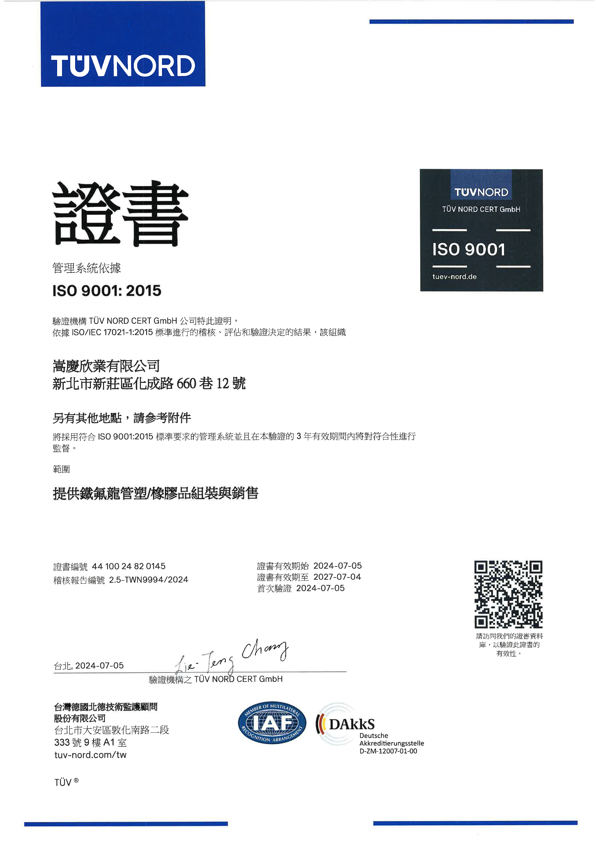 我們成功通過了ISO 9001:2015認證,並依據ISO/IEC 17021-1:2015標準進行稽核、評估和驗證。這一國際認證彰顯了我們在品質管理和持續改進方面的不懈努力與承諾。我們將繼續致力於為全球客戶提供卓越的產品和服務。