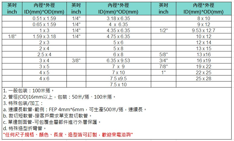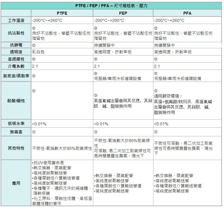 耐高/低溫、耐強酸鹼、抗沾黏、高耐化性,屬使用成本低,效能高的通用型管件。 PTFE TUBE/鐵氟龍管/PTFE鐵氟龍軟管/ PTFE鐵氟龍彩色管/PTFE鐵氟龍彩條管/ PTFE鐵氟龍裁切管