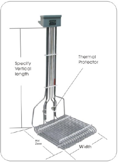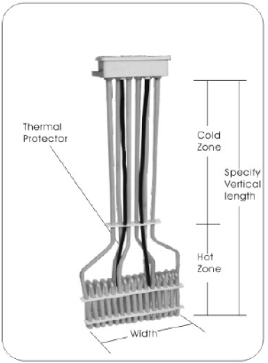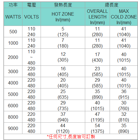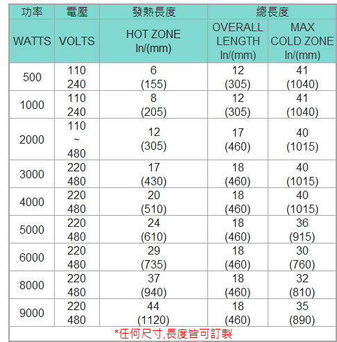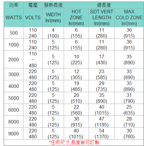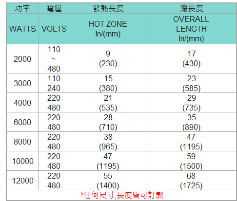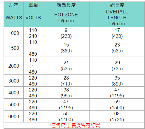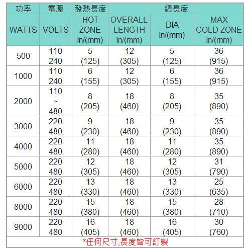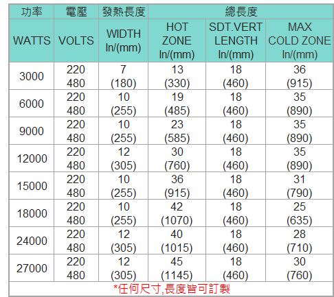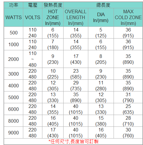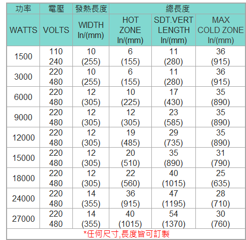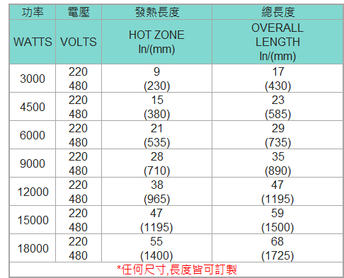 - 電熱器體積尺寸不可隨意更改(改小表面積),將使表面功率過大,影響電熱器使用壽命。